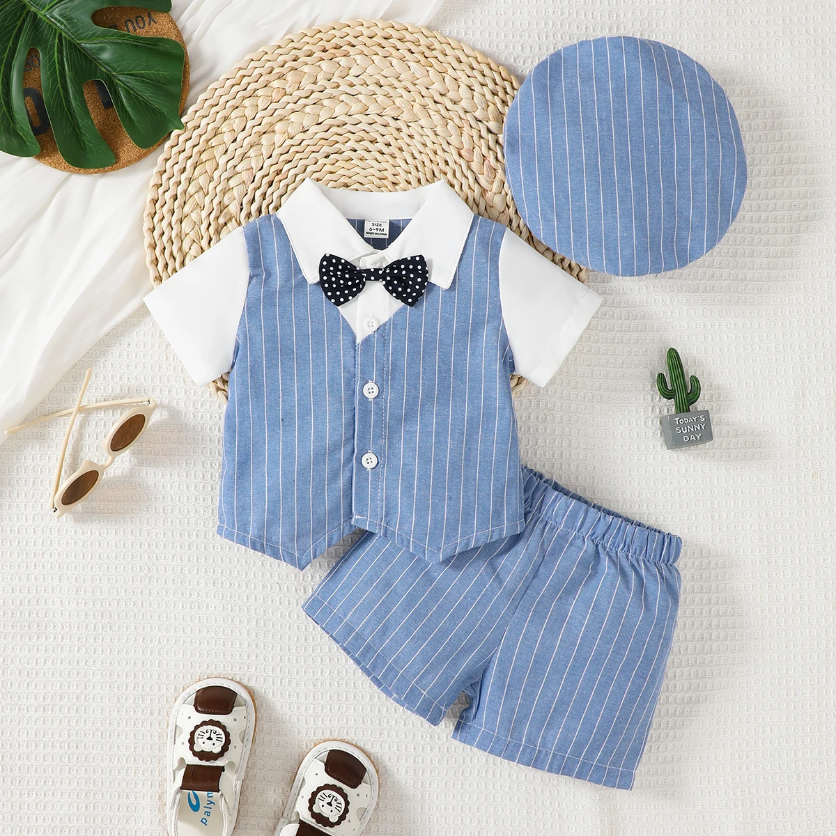 Baby Boy Little Gentleman Set Lapel Stripe Fake Two piece Top and Shorts Set Suitable for 0-3 Year Toddlers Birthday Party Set
